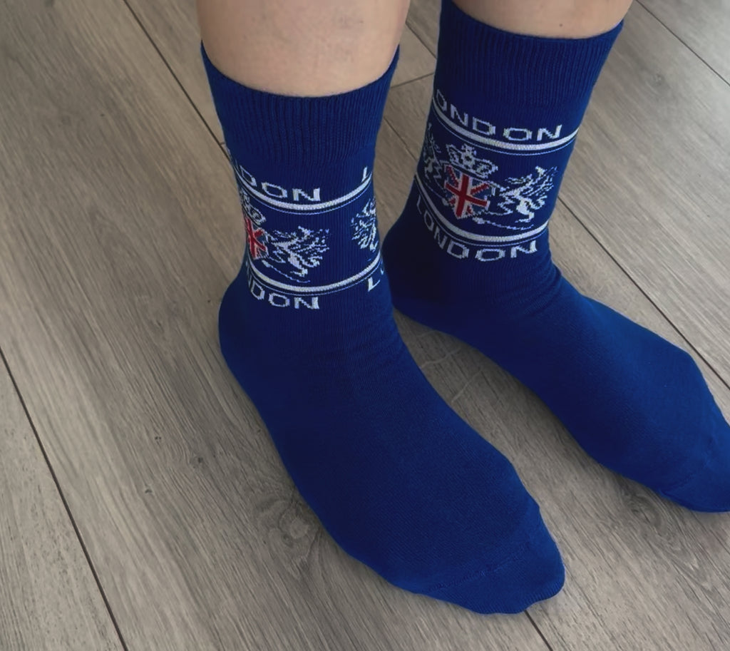 Blue Union Jack British Flag Dragon London Patriotic Socks, Novelty Fun Gift Socks